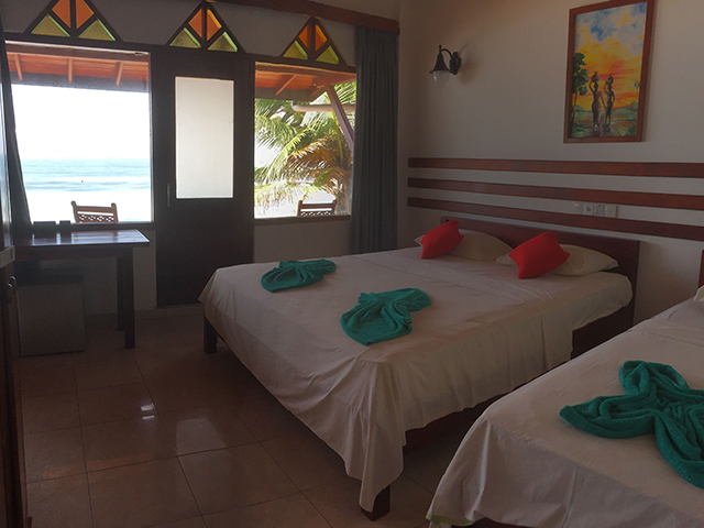 Rooms have full sea view, with private balcony overlooking the beach, hot-water ensuite bathroom, air-conditioning and ceiling fan, mini-fridge, hand-crafted timber furniture and quality mattresses, room safe and lockable closet (own padlock required).